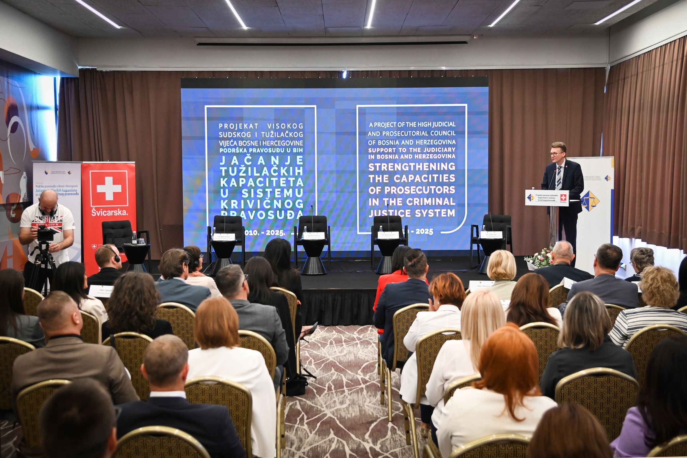 (Sarajevo, 23. septembar 2025. godine) – Uspostavljanje sistema normiranja i ocjenjivanja rada tužilaca, efikasno rješavanje zaostalih predmeta, formiranje Stalne komisije za efikasnost i kvalitet tužilaštava, kao i donošenje niza mjera i dokumenata koji čine pravni okvir neophodan za kvalitetan rad tužilaštava, samo su neki od rezultata koji su postignuti tokom realizacije Projekta „Jačanje tužilačkih kapaciteta u sistemu krivičnog pravosuđa“, kojeg je Visoko sudsko i tužilačko vijeće Bosne i Hercegovine (VSTV BIH) implementiralo uz finansijsku podršku Švicarske agencije za razvoj i saradnju (SDC).
